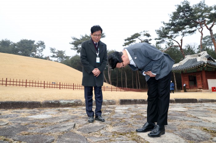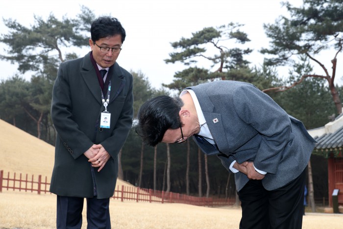 [서울=뉴스핌] 정일구 기자 = 김민석 국무총리가 13일 오후 서울 노원구 강릉을 방문해 1.29 도심주택공급방안 관련 태릉CC 현장점검에 앞서 예를 올리고 있다. 2026.02.13 mironj19@newspim.com