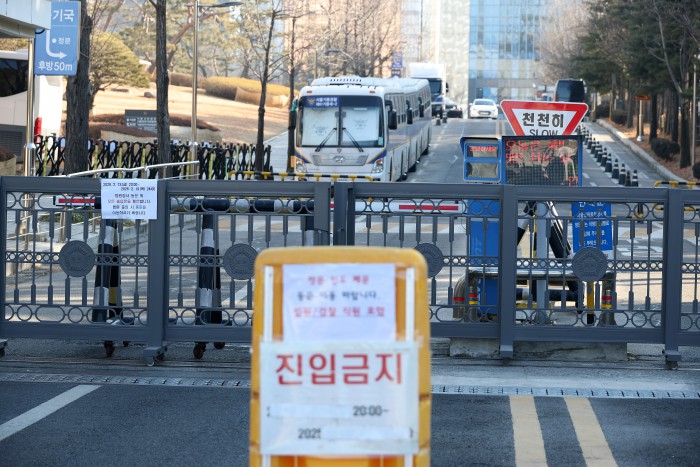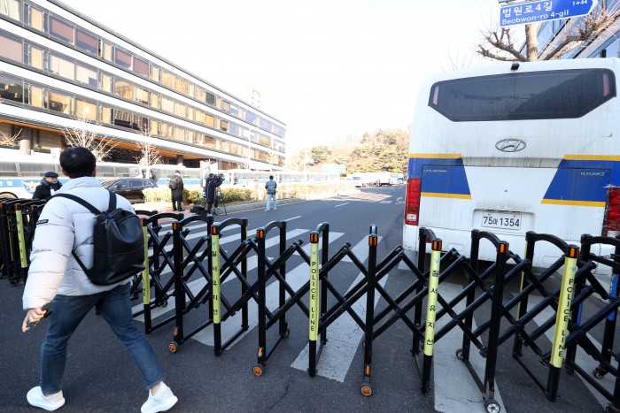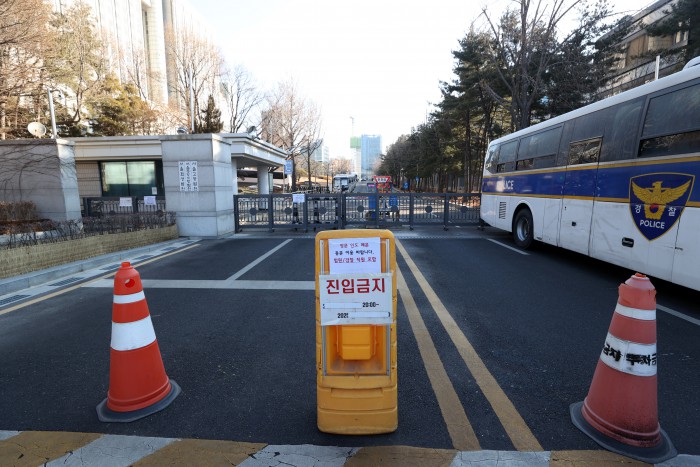 [서울=뉴스핌] 정일구 기자 = 윤석열 전 대통령의 내란 우두머리 혐의에 대한 1심 선고기일인 19일 오후 서울 서초구 서울중앙지방법원 입구가 경찰이 세운 차벽으로 통제되고 있다. 2026.02.19 mironj19@newspim.com