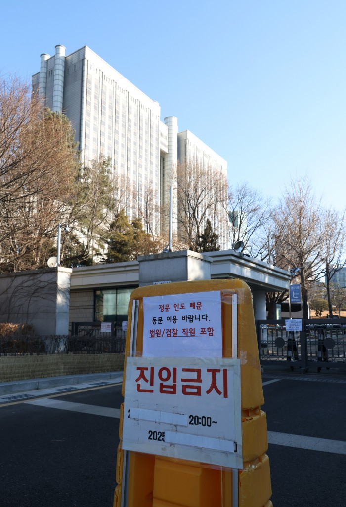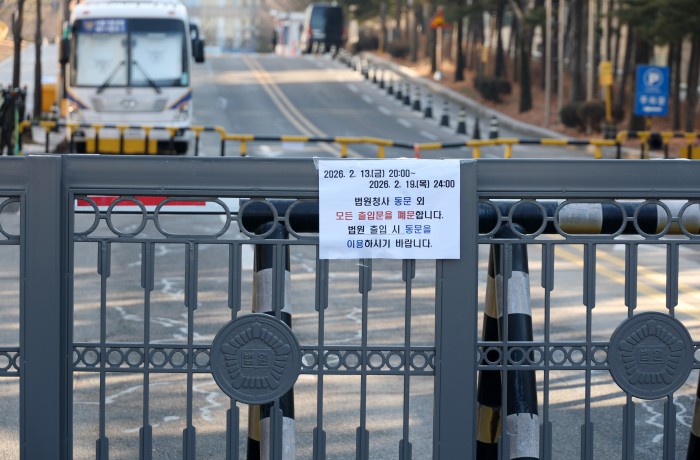 [서울=뉴스핌] 정일구 기자 = 윤석열 전 대통령의 내란 우두머리 혐의에 대한 1심 선고기일인 19일 오전 서울 서초구 서울중앙지방법원 입구가 출입 통제되고 있다. 2026.02.19 mironj19@newspim.com