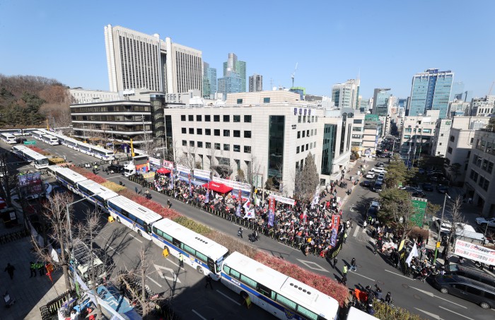 [서울=뉴스핌] 정일구 기자 = 윤석열 전 대통령의 내란 우두머리 혐의에 대한 1심 선고기일인 19일 오후 서울 서초구 서울중앙지방법원 입구가 경찰이 세운 차벽으로 통제된 가운데 윤 전 대통령 지지자들이 집회를 하고 있다. 2026.02.19 mironj19@newspim.com