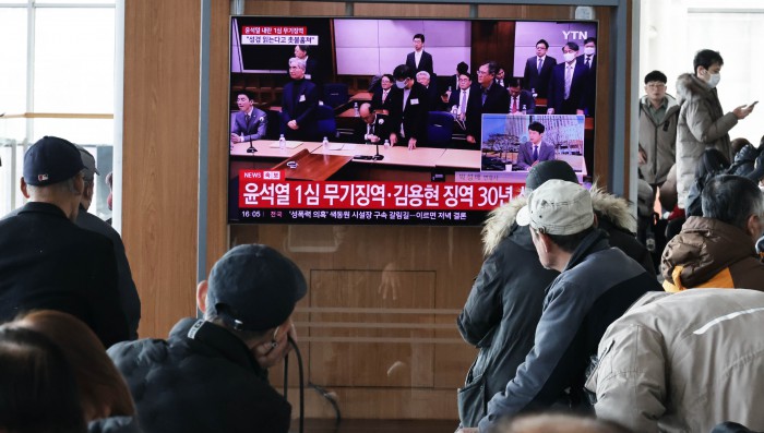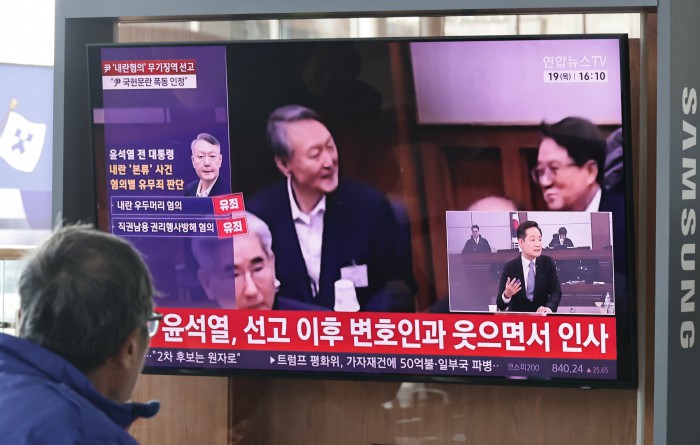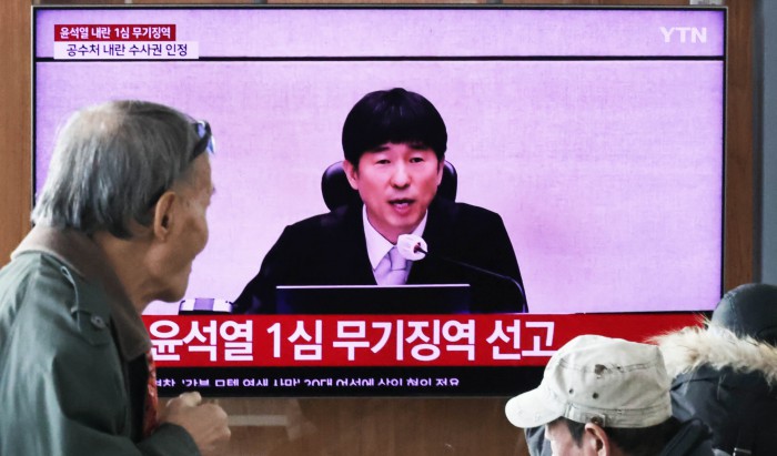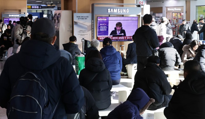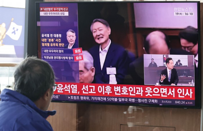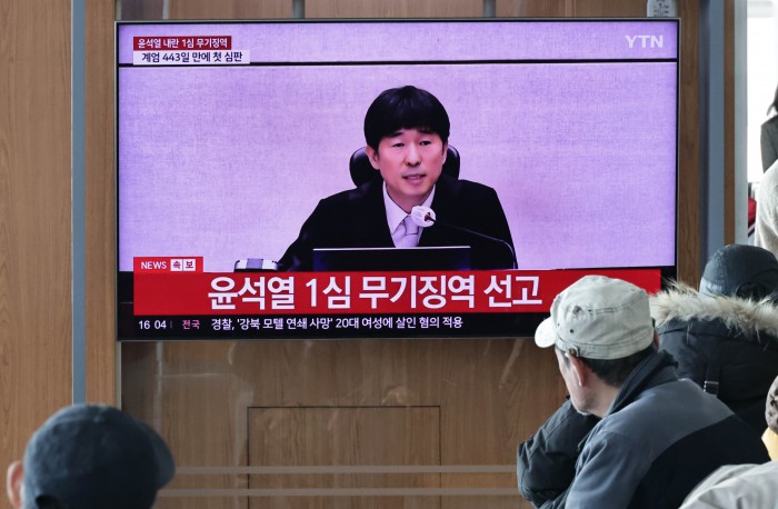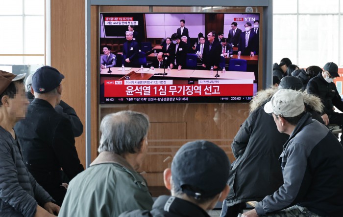 [서울=뉴스핌] 양윤모 기자 = 19일 오후 서울역을 찾은 시민들이 12·3 비상계엄 내란 우두머리 혐의로 기소된 윤석열 전 대통령의 1심 무기징역 선고방송을 시청하고 있다.
