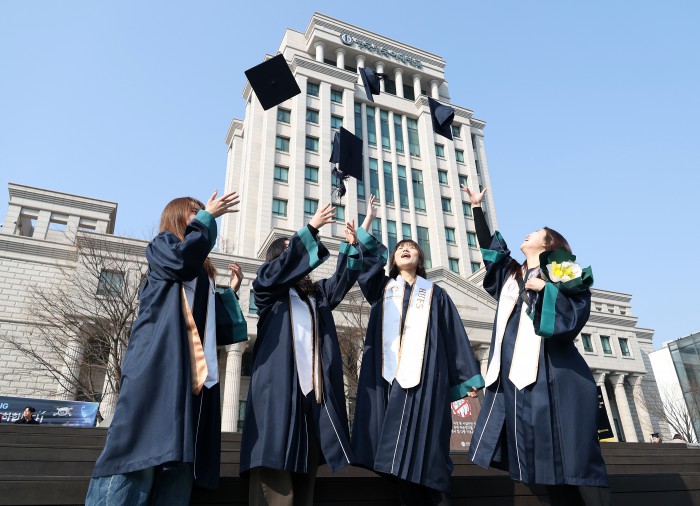 [서울=뉴스핌] 정일구 기자 = 20일 서울 동대문구 한국외국어대학교에서 열린 2026년 전기 학위수여식에서 졸업생들이 학사모를 던지고 있다. 2026.02.20 mironj19@newspim.com