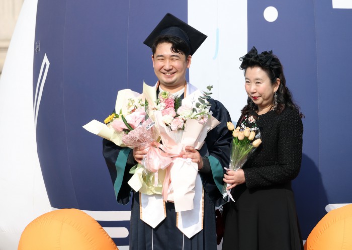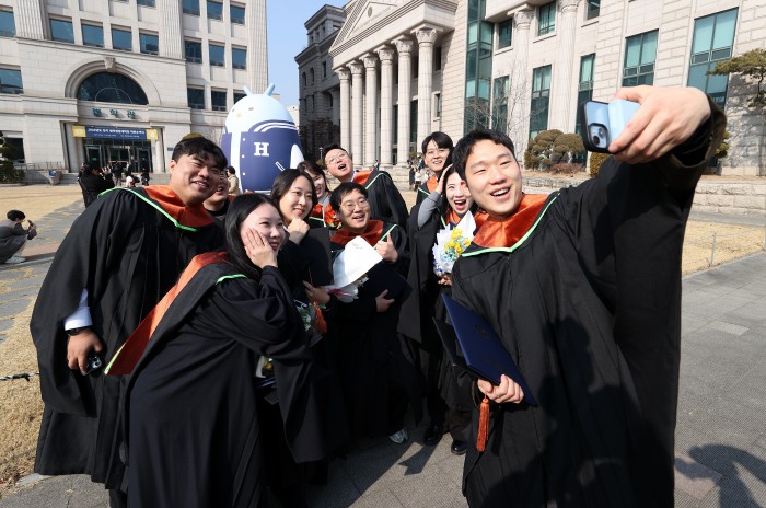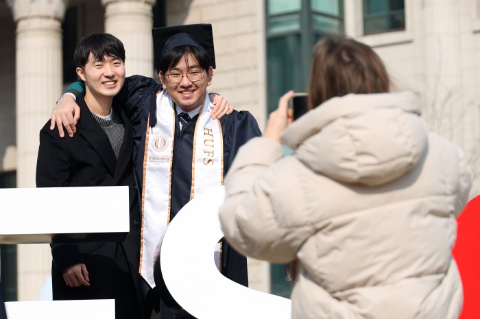 [서울=뉴스핌] 정일구 기자 = 20일 서울 동대문구 한국외국어대학교에서 열린 2026년 전기 학위수여식에서 졸업생이 기념촬영을 하고 있다. 2026.02.20 mironj19@newspim.com