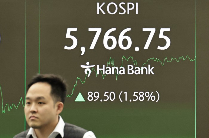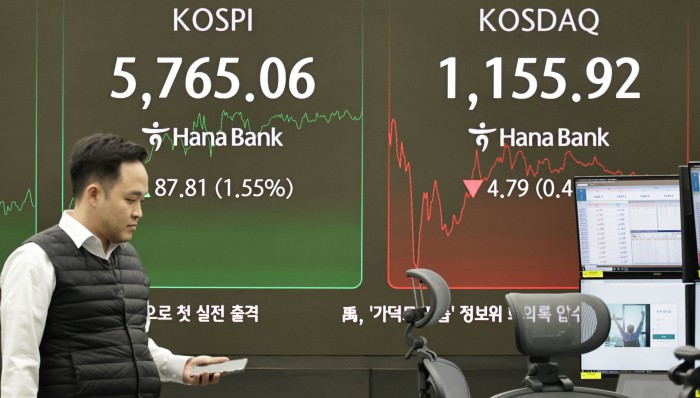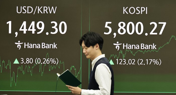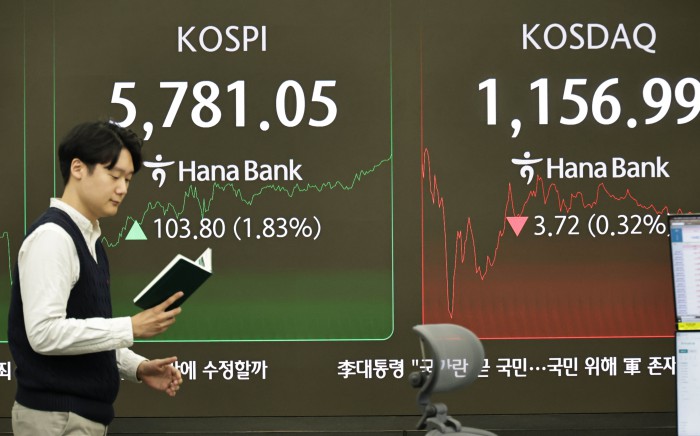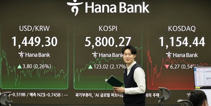 [서울=뉴스핌] 양윤모 기자= 20일 오후 코스피가 전장 종가보다 123.02 포인트(2.17%) 상승하며 5800.27로, 코스닥은 6.27포인트(0.54%) 하락한 1154.44로 거래되는 가운데, 서울 중구 하나은행본점 딜링룸에서 직원들이 업무를 보고 있다.