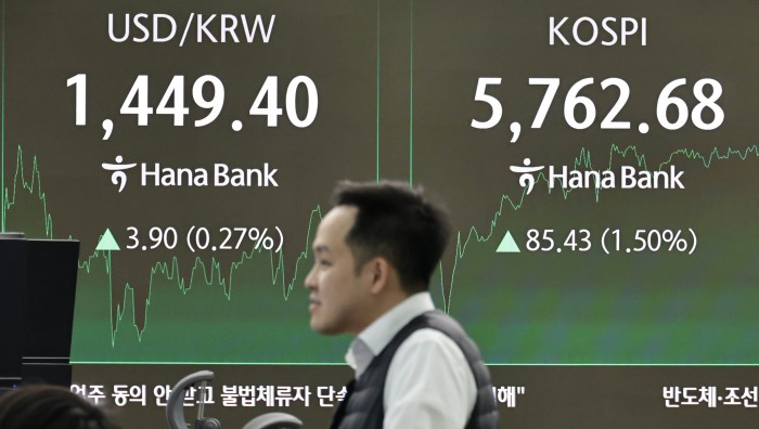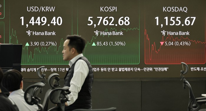 [서울=뉴스핌] 양윤모 기자= 20일 오후 코스피가 전장 종가보다 85.43 포인트(1.50%) 상승하며 5762.68 로, 코스닥은 5.04 포인트(0.43%) 하락한 1155.67로 거래되는 가운데, 서울 중구 하나은행본점 딜링룸에서 직원들이 업무를 보고 있다.