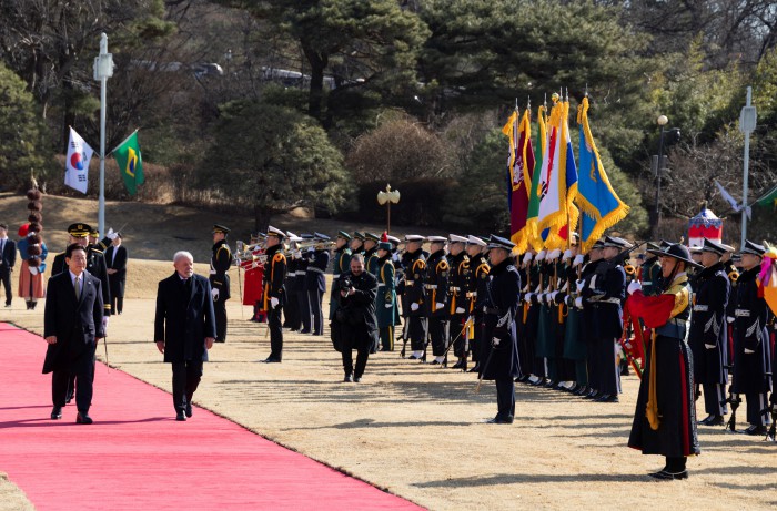 [서울=로이터뉴스핌] 이재명 대통령과 루이스 이나시우 룰라 다 시우바 브라질 대통령이 23일 오전 서울 청와대에서 정상회담을 앞두고 의장대를 사열하고 있다. 2026.02.23 photo@newspim.com
