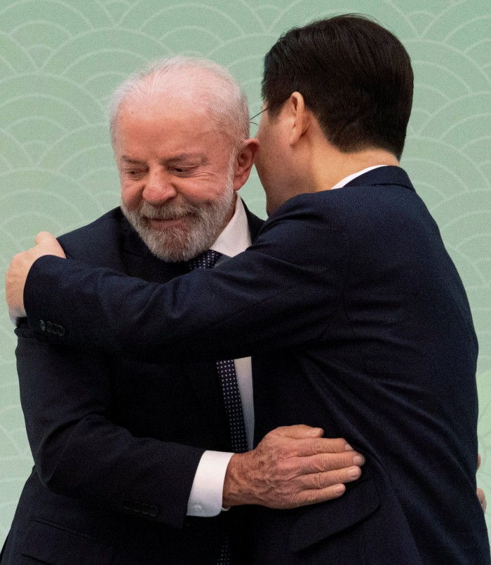 [서울=로이터뉴스핌] 이재명 대통령이 23일 오후 서울 청와대에서 루이스 이나시우 룰라 다 시우바 브라질 대통령과 정상회담을 마치고 열린 공동 기자회견에서 포옹을 하고 있다. 2026.02.23 photo@newspim.com