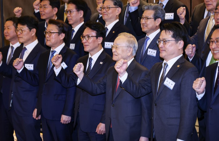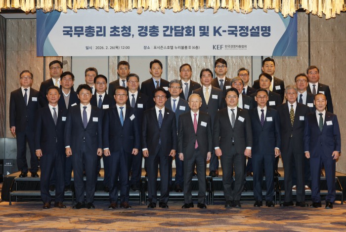 [서울=뉴스핌] 류기찬 기자 = 김민석 국무총리와 손경식 경총 회장을 비롯한 참석자들이 26일 오후 서울 종로구 포시즌스 호텔 서울에서 열린 ‘한국경영자총협회 오찬 간담회 및 K-국정설명회’에서 기념촬영을 하고 있다. 2026.02.26 ryuchan0925@newspim.com