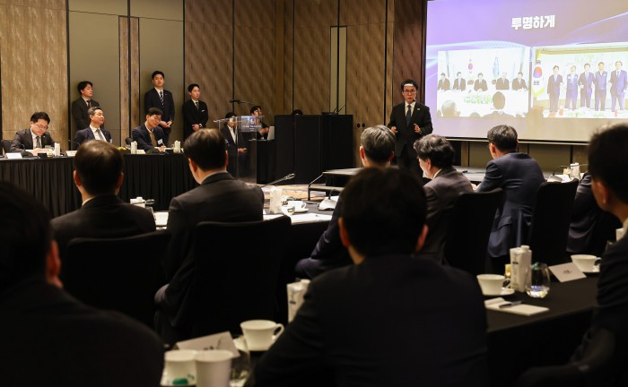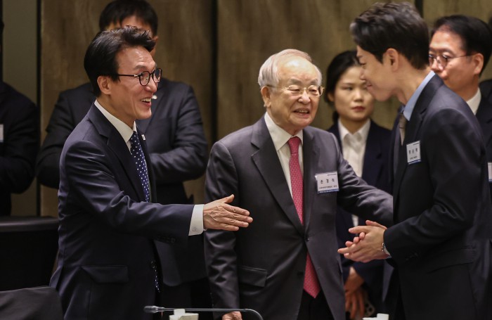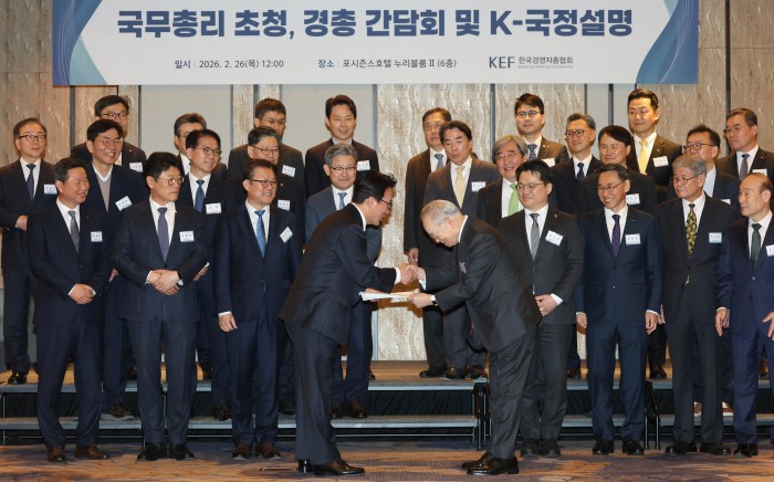 [서울=뉴스핌] 류기찬 기자 = 김민석 국무총리가 26일 오후 서울 종로구 포시즌스 호텔 서울에서 열린 ‘한국경영자총협회 오찬 간담회 및 K-국정설명회’에서 손경식 경총 회장에게 건의사항을 전달받은 뒤 기념촬영을 하고 있다. 2026.02.26 ryuchan0925@newspim.com