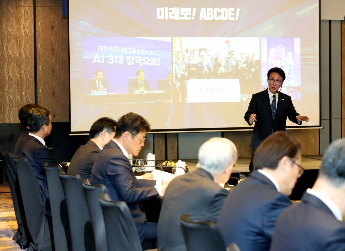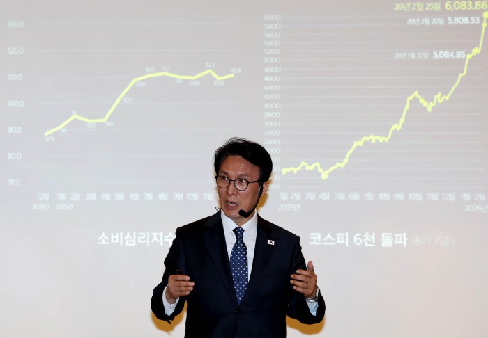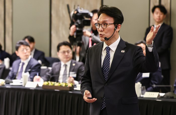 [서울=뉴스핌] 류기찬 기자 = 김민석 국무총리가 26일 오후 서울 종로구 포시즌스 호텔 서울에서 열린 ‘한국경영자총협회 오찬 간담회 및 K-국정설명회’에서 강연을 하고 있다. 2026.02.26 ryuchan0925@newspim.com