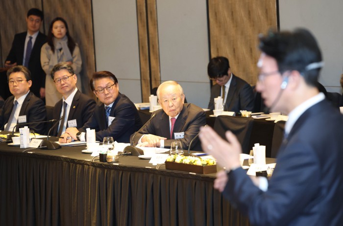 [서울=뉴스핌] 류기찬 기자 = 손경식 경총 회장이 26일 오후 서울 종로구 포시즌스 호텔 서울에서 열린 ‘한국경영자총협회 오찬 간담회 및 K-국정설명회’에서 김민석 국무총리의 강연을 듣고 있다. 2026.02.26 ryuchan0925@newspim.com