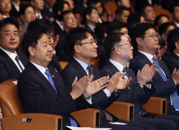 [서울=뉴스핌] 김현우 기자 = 구윤철 경제부총리 겸 재정경제부 장관(앞줄 왼쪽 부터)과 임광현 국세청장이 3일 오전 서울 강남구 코엑스 오디토리움에서 열린 제60회 납세자의 날 기념식에서 박수를 치고 있다. 2026.03.03 khwphoto@newspim.com