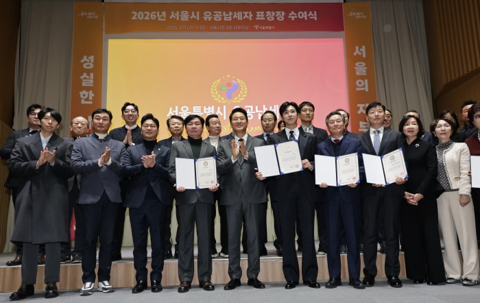 [서울=뉴스핌] 양윤모 기자 = 오세훈 서울시장이 11일 오전 서울시청 3층 대회의실에서 개최된 '서울시 26년 유공납세자 표창장 수여식‘행사에 참석해 표창장을 수여후 기념촬영을 하고 있다. 2026.03.11 yym58@newspim.com