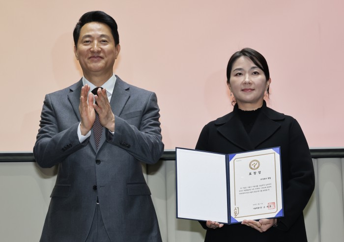 [서울=뉴스핌] 양윤모 기자 = 오세훈 서울시장이 11일 오전 서울시청 3층 대회의실에서 개최된 '서울시 26년 유공납세자 표창장 수여식‘행사에 참석해 주식회사 평일 관계자에게 표창장을 수여후 박수를 보내고 있다. 2026.03.11 yym58@newspim.com