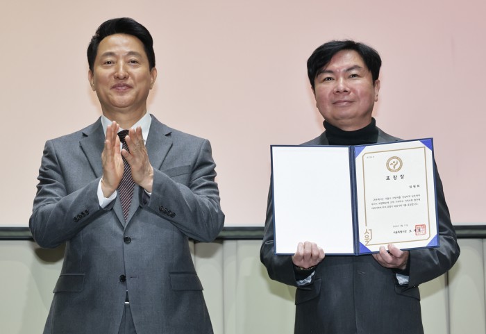 [서울=뉴스핌] 양윤모 기자 = 오세훈 서울시장이 11일 오전 서울시청 3층 대회의실에서 개최된 '서울시 26년 유공납세자 표창장 수여식‘행사에 참석해 정윤호씨에게 표창장을 수여후 박수를 보내고 있다. 2026.03.11 yym58@newspim.com