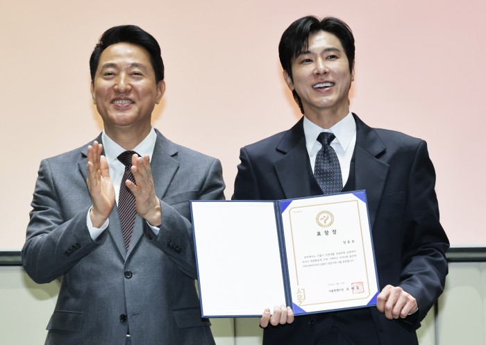 [서울=뉴스핌] 양윤모 기자 = 오세훈 서울시장이 11일 오전 서울시청 3층 대회의실에서 개최된 '서울시 26년 유공납세자 표창장 수여식‘행사에 참석해 배우 임원희씨에게 표창장을 수여후 박수를 보내고 있다. 2026.03.11 yym58@newspim.com