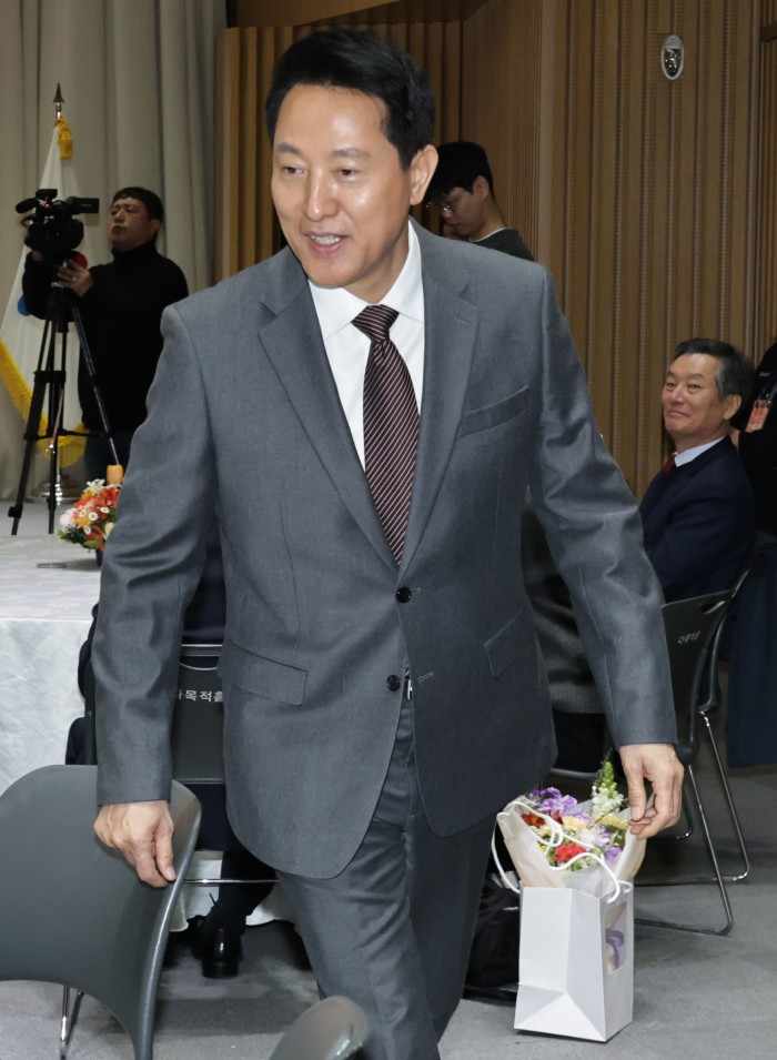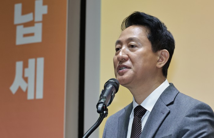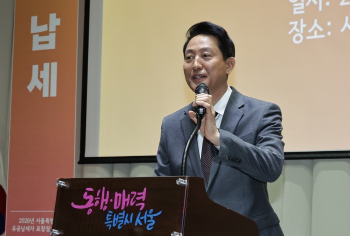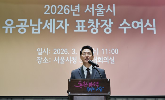 [서울=뉴스핌] 양윤모 기자 = 오세훈 서울시장이 11일 오전 서울시청 3층 대회의실에서 개최된 '서울시 26년 유공납세자 표창장 수여식‘행사에 참석하고 있다. 2026.03.11 yym58@newspim.com