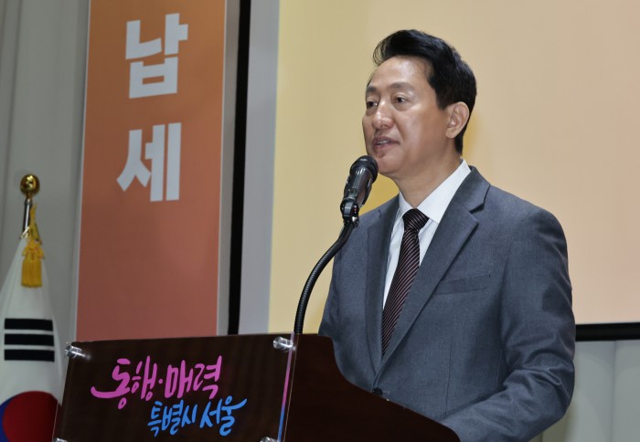 [서울=뉴스핌] 양윤모 기자 = 오세훈 서울시장이 11일 오전 서울시청 3층 대회의실에서 개최된 '서울시 26년 유공납세자 표창장 수여식‘행사에 참석해 인사말을 하고 있다. 2026.03.11 yym58@newspim.com