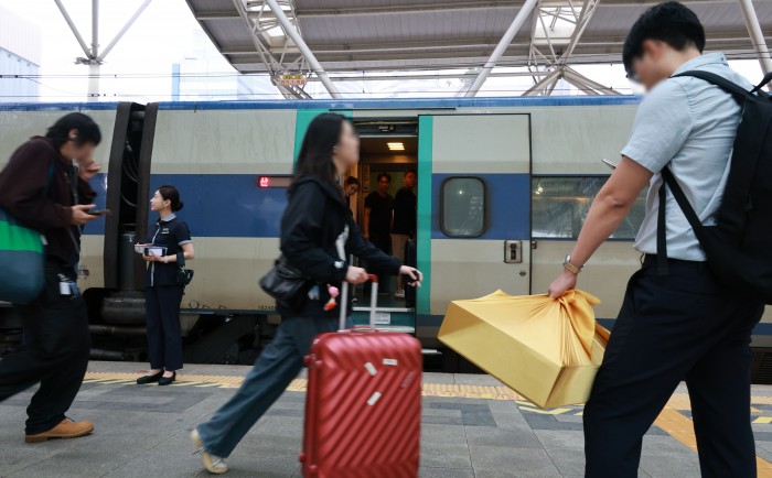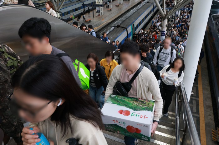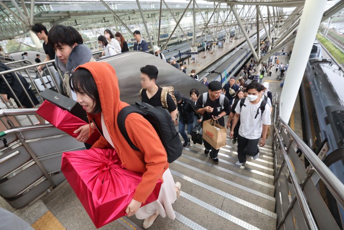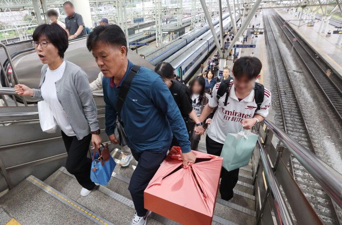 [서울=뉴스핌] 김학선 기자 = 추석 전날인 5일 서울역에 도착한 역귀성객들이 선물을 들고 열차 플랫폼을 빠져나가고 있다. 2025.10.05 yooksa@newspim.com