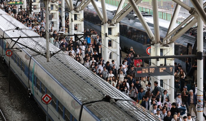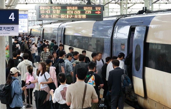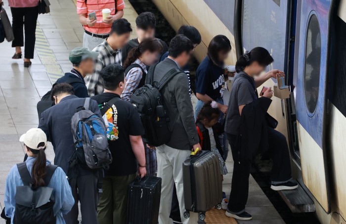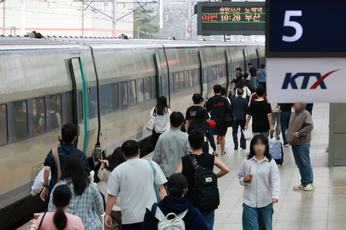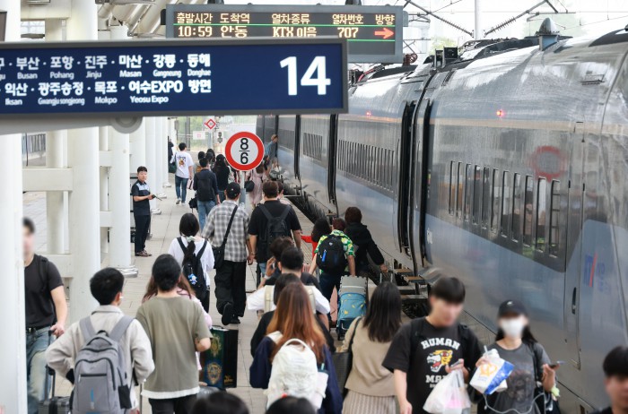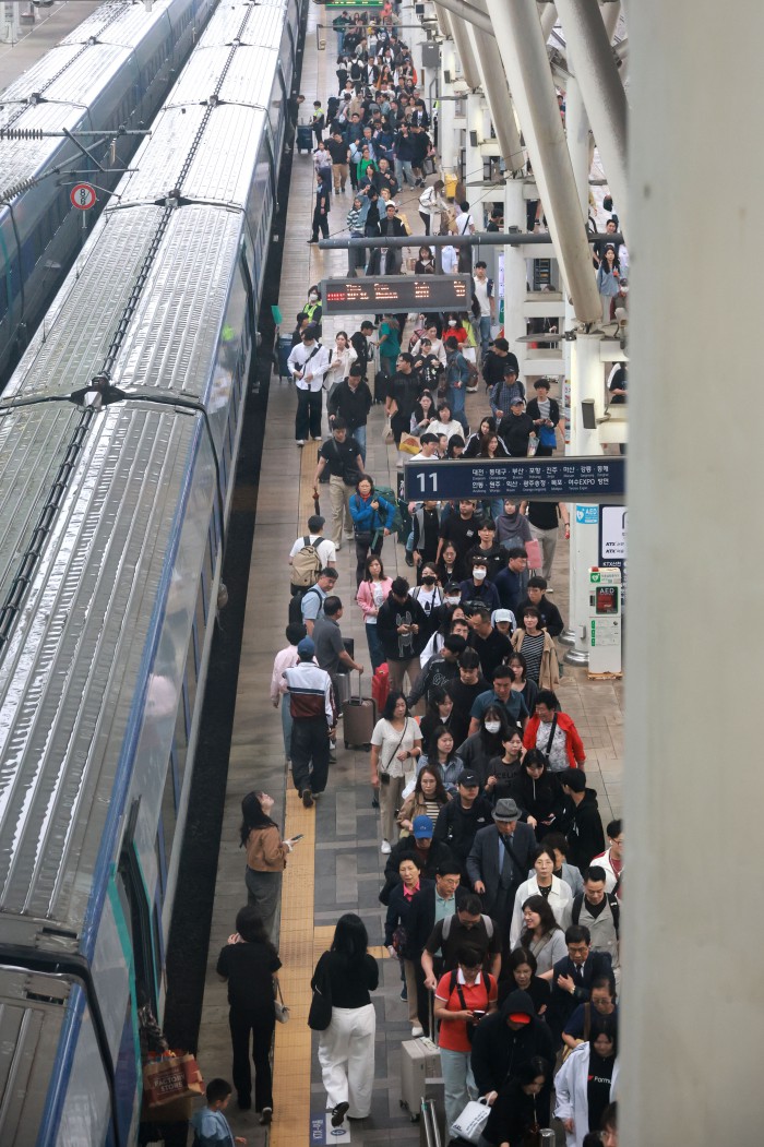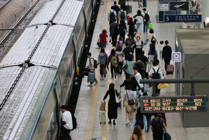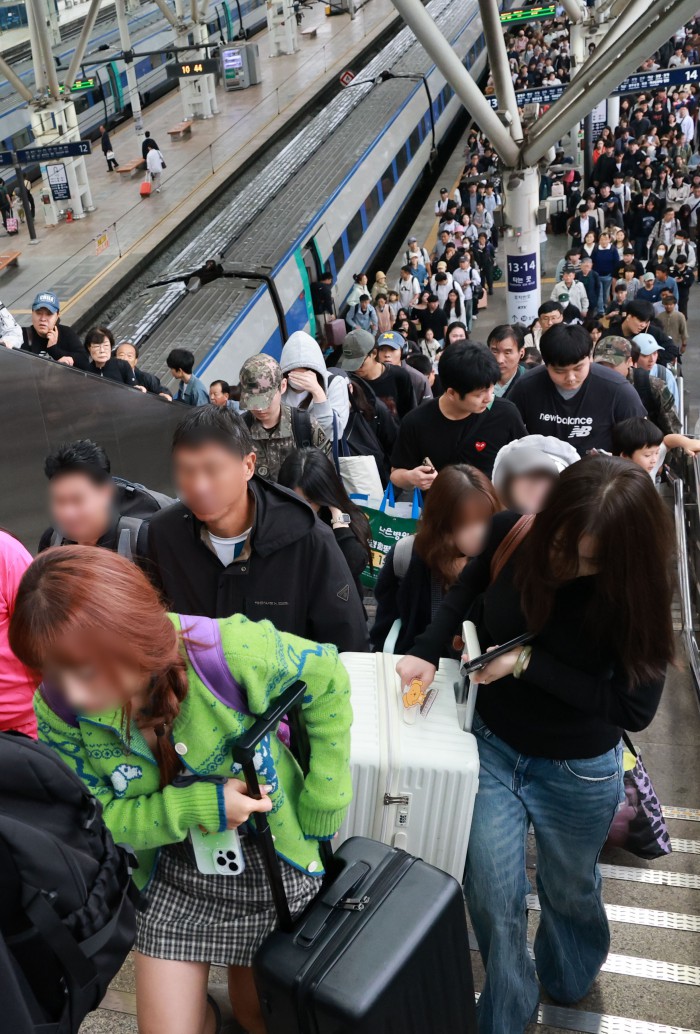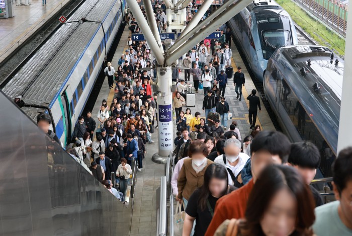 [서울=뉴스핌] 김학선 기자 = 추석 전날인 5일 서울역에서 귀경객들이 열차 플랫폼을 빠져나가고 있다. 2025.10.05 yooksa@newspim.com