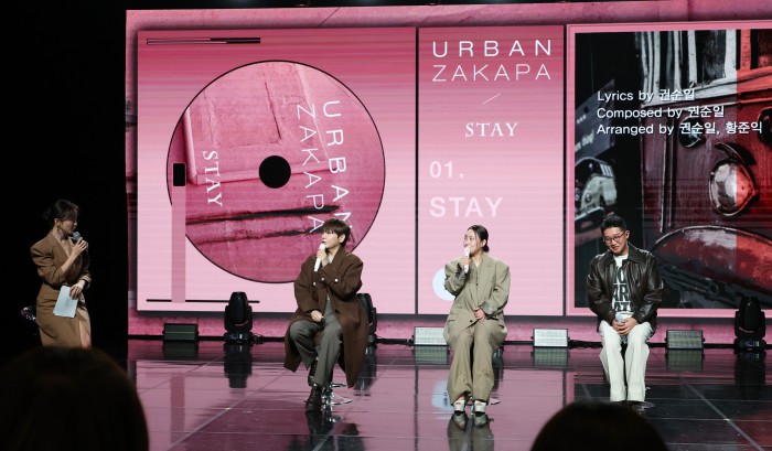 [서울=뉴스핌] 최지환 기자 = 어반자카파 멤버 조현아, 권순일, 박용인이 3일 오후 서울 강남구 일지아트홀에서 열린 어반자카파 신규 EP앨범 'STAY' 발매 쇼케이스에서 타이틀곡 STAY 무대를 선보이고 있다. 2025.11.03 choipix16@newspim.com