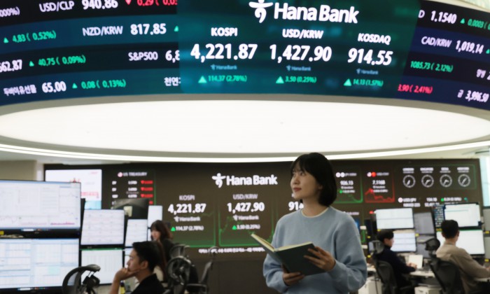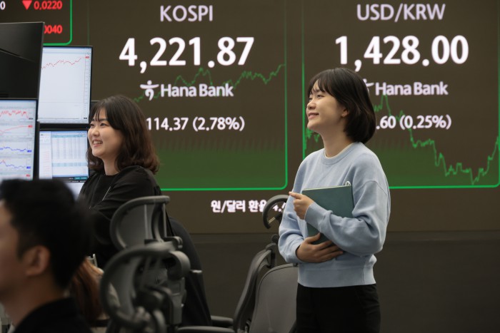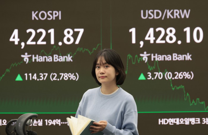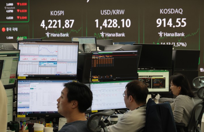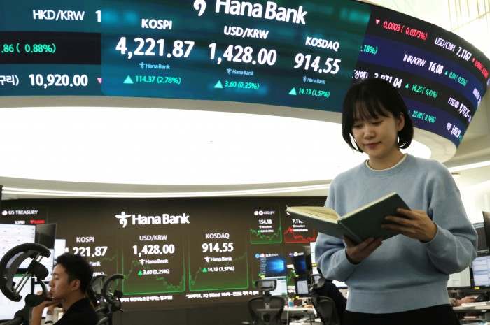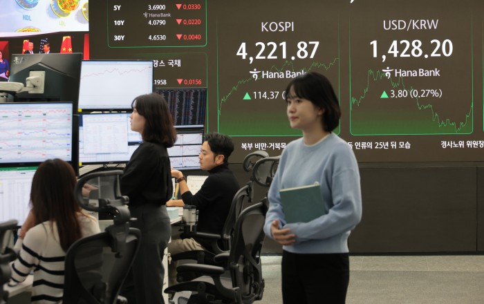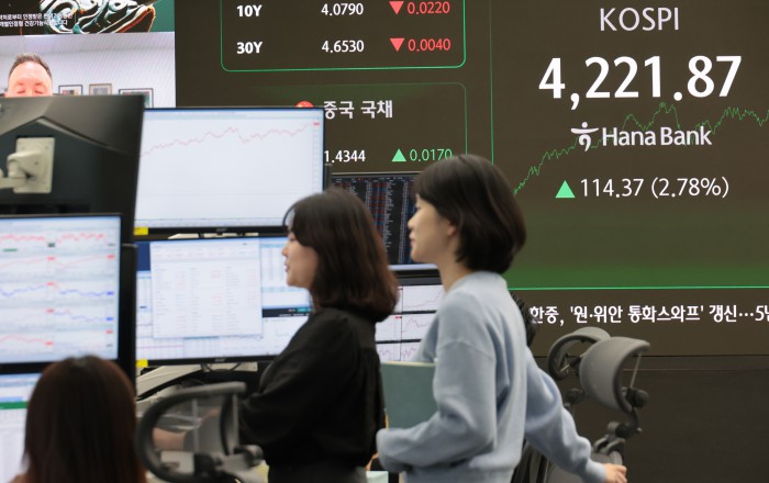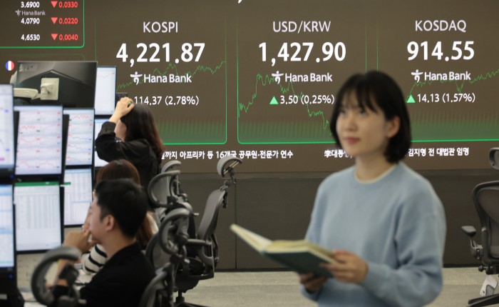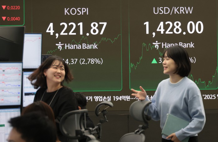 [서울=뉴스핌] 이길동 기자 = 3일 서울 중구 하나은행 딜링룸에 코스피 지수가 표시되어 있다. 이날 코스피는 전 거래일보다 114.37p(2.78%) 오른 4,221.87에 코스닥 지수는 전 거래일보다 14.13p(01.57%) 오른 914.55에 거래를 마감했다. 서울 외환시장에서 달러/원 환율은 전 거래일 주간거래 종가 대비 3.50원 상승한 1,427.90원에 주간 거래를 마감했다.2025.11,03 gdlee@newspim.com