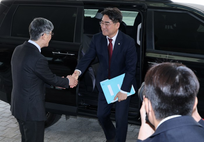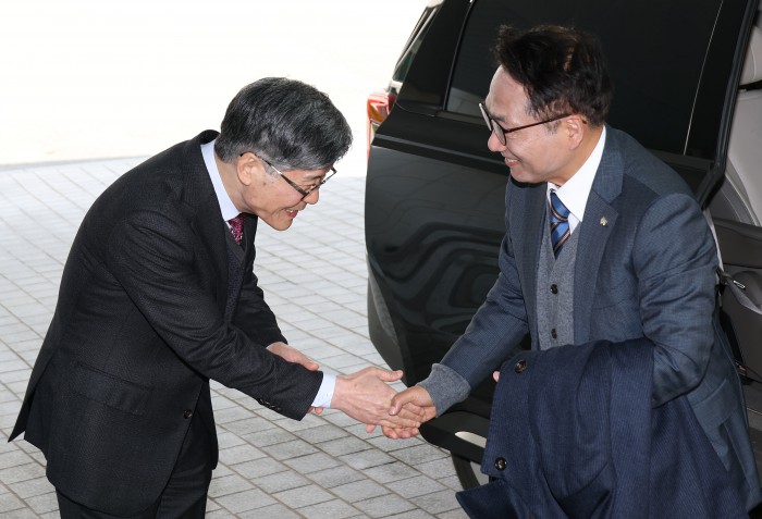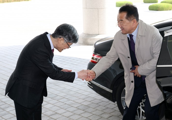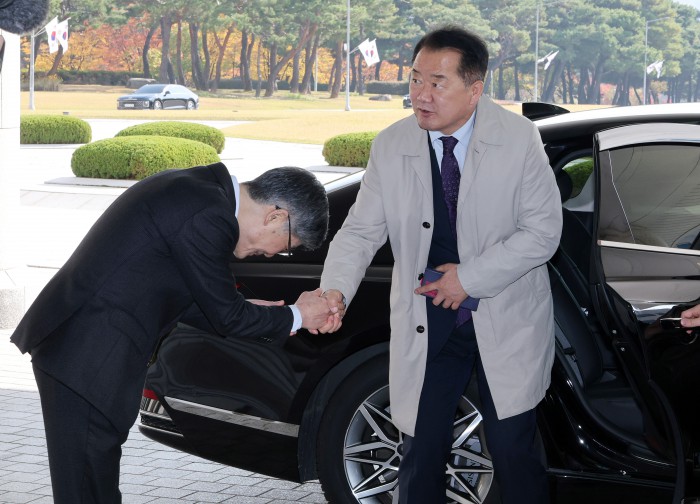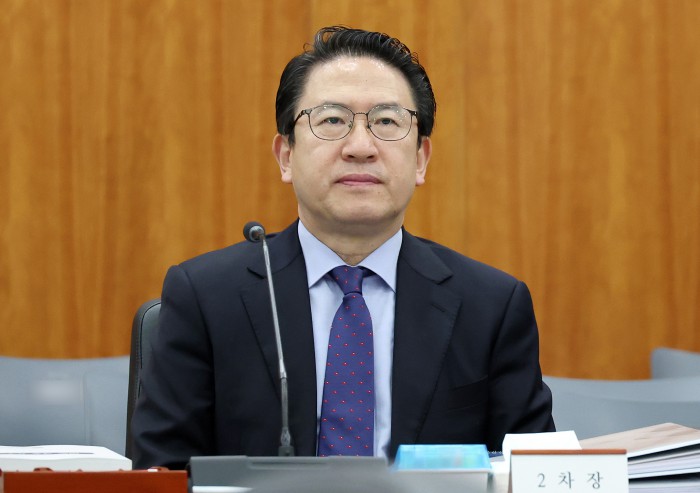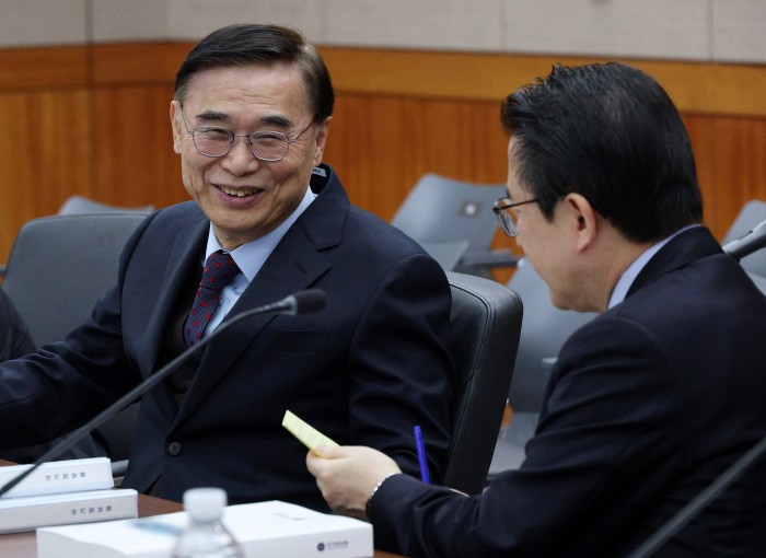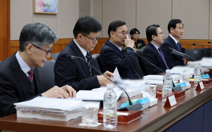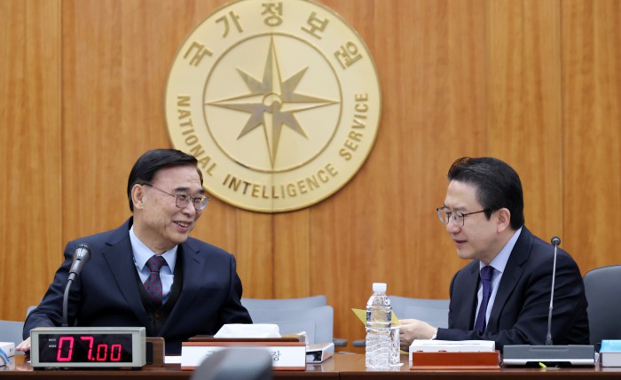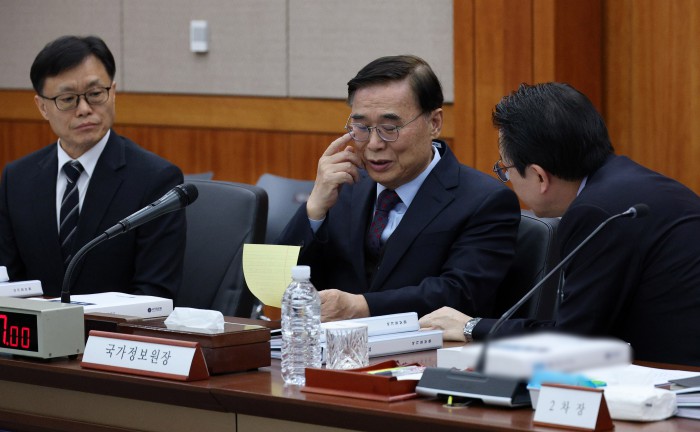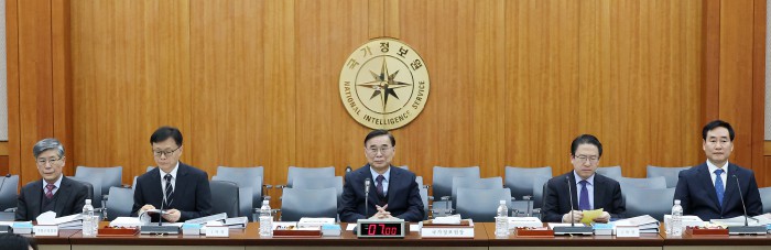 [서울=뉴스핌] 정일구 기자 = 국가정보원 김희수 기획조정실장(왼쪽부터), 이동수 제1차장, 이종석 원장, 김호홍 제2차장, 김창섭 제3차장이 4일 서울 서초구 국가정보원에서 열린 국회 정보위원회 국정원에 대한 국정감사에 출석해 있다. 2025.11.04 mironj19@newspim.com